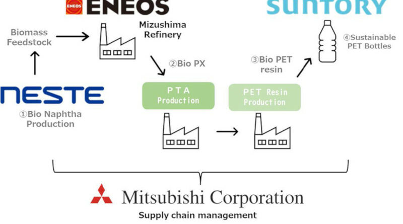 Mitsubishi Corporation is pleased to announce that MC, Suntory Holdings Limited and Eneos Corporation have reached an agreement to build a supply chain for sustainable PET bottles derived from biomass *1 such as used cooking oil applying a mass balance approach*2 to allocate bio-based materials. The supply chain is as follows,